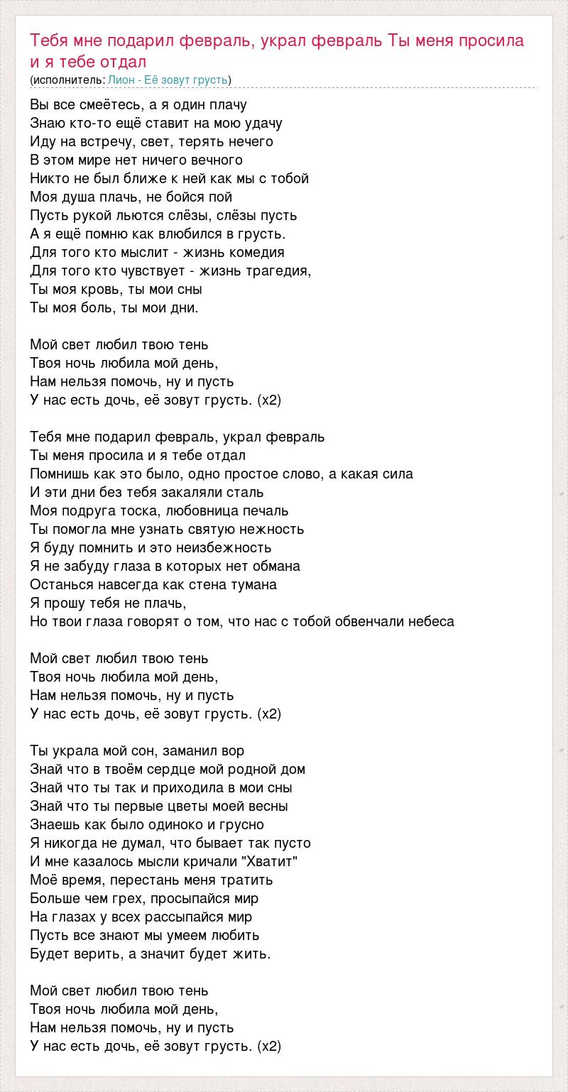 Вы все смеётесь, а я один плачу Знаю кто-то ещё ставит на мою удачу Иду на встречу, свет, терять нечего В этом мире нет ничего вечного Никто не был ближе к ней как мы с тобой Моя душа плачь, не бойся пой Пусть рукой льются слёзы, слёзы пусть А я ещё помню как влюбился в грусть. Для того кто мыслит - жизнь комедия Для того кто чувствует - жизнь трагедия, Ты моя кровь, ты мои сны Ты моя боль, ты мои дни. Мой свет любил твою тень Твоя ночь любила мой день, Нам нельзя помочь, ну и пусть У нас есть дочь, её зовут грусть. (х2) Тебя мне подарил февраль, украл февраль Ты меня просила и я тебе отдал Помнишь как это было, одно простое слово, а какая сила И эти дни без тебя закаляли сталь Моя подруга тоска, любовница печаль Ты помогла мне узнать святую нежность Я буду помнить и это неизбежность Я не забуду глаза в которых нет обмана Останься навсегда как стена тумана Я прошу тебя не плачь, Но твои глаза говорят о том, что нас с тобой обвенчали небеса Мой свет любил твою тень Твоя ночь любила мой день, Нам нельзя помочь, ну и пусть У нас есть дочь, её зовут грусть. (х2) Ты украла мой сон, заманил вор Знай что в твоём сердце мой родной дом Знай что ты так и приходила в мои сны Знай что ты первые цветы моей весны Знаешь как было одиноко и грусно Я никогда не думал, что бывает так пусто И мне казалось мысли кричали "Хватит" Моё время, перестань меня тратить Больше чем грех, просыпайся мир На глазах у всех рассыпайся мир Пусть все знают мы умеем любить Будет верить, а значит будет жить. Мой свет любил твою тень Твоя ночь любила мой день, Нам нельзя помочь, ну и пусть У нас есть дочь, её зовут грусть. (х2)