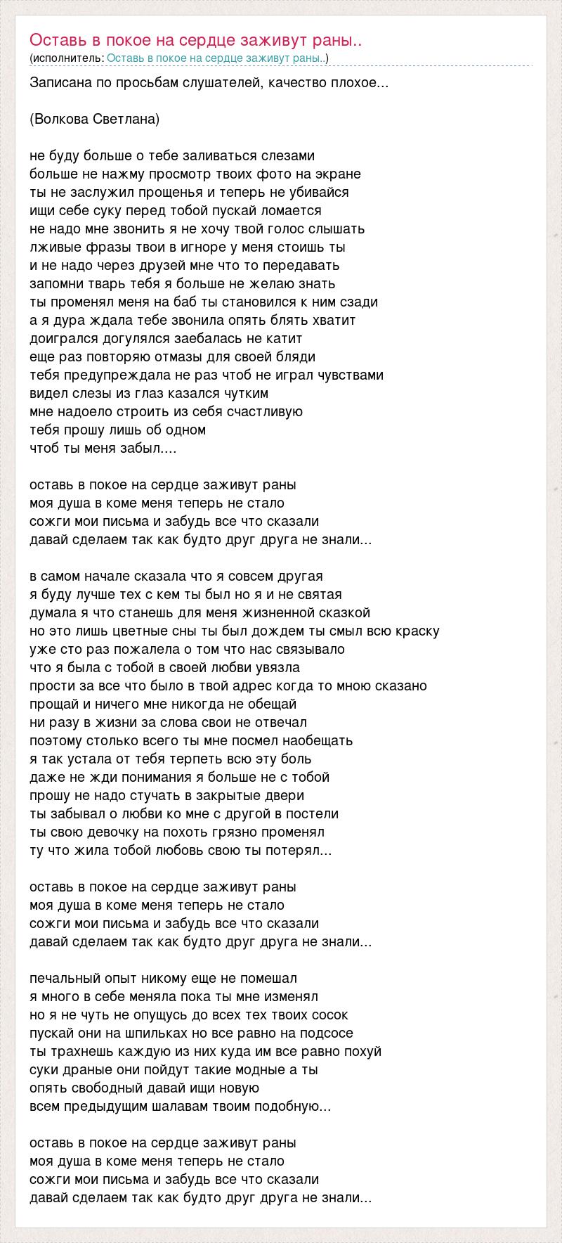 Записана по просьбам слушателей, качество плохое... (Волкова Светлана) не буду больше о тебе заливаться слезами больше не нажму просмотр твоих фото на экране ты не заслужил прощенья и теперь не убивайся ищи себе суку перед тобой пускай ломается не надо мне звонить я не хочу твой голос слышать лживые фразы твои в игноре у меня стоишь ты и не надо через друзей мне что то передавать запомни тварь тебя я больше не желаю знать ты променял меня на баб ты становился к ним сзади а я дура ждала тебе звонила опять блять хватит доигрался догулялся заебалась не катит еще раз повторяю отмазы для своей бляди тебя предупреждала не раз чтоб не играл чувствами видел слезы из глаз казался чутким мне надоело строить из себя счастливую тебя прошу лишь об одном чтоб ты меня забыл.... оставь в покое на сердце заживут раны моя душа в коме меня теперь не стало сожги мои письма и забудь все что сказали давай сделаем так как будто друг друга не знали... в самом начале сказала что я совсем другая я буду лучше тех с кем ты был но я и не святая думала я что станешь для меня жизненной сказкой но это лишь цветные сны ты был дождем ты смыл всю краску уже сто раз пожалела о том что нас связывало что я была с тобой в своей любви увязла прости за все что было в твой адрес когда то мною сказано прощай и ничего мне никогда не обещай ни разу в жизни за слова свои не отвечал поэтому столько всего ты мне посмел наобещать я так устала от тебя терпеть всю эту боль даже не жди понимания я больше не с тобой прошу не надо стучать в закрытые двери ты забывал о любви ко мне с другой в постели ты свою девочку на похоть грязно променял ту что жила тобой любовь свою ты потерял... оставь в покое на сердце заживут раны моя душа в коме меня теперь не стало сожги мои письма и забудь все что сказали давай сделаем так как будто друг друга не знали... печальный опыт никому еще не помешал я много в себе меняла пока ты мне изменял но я не чуть не опущусь до всех тех твоих сосок пускай они на шпильках но все равно на подсосе ты трахнешь каждую из них куда им все равно похуй суки драные они пойдут такие модные а ты опять свободный давай ищи новую всем предыдущим шалавам твоим подобную... оставь в покое на сердце заживут раны моя душа в коме меня теперь не стало сожги мои письма и забудь все что сказали давай сделаем так как будто друг друга не знали...