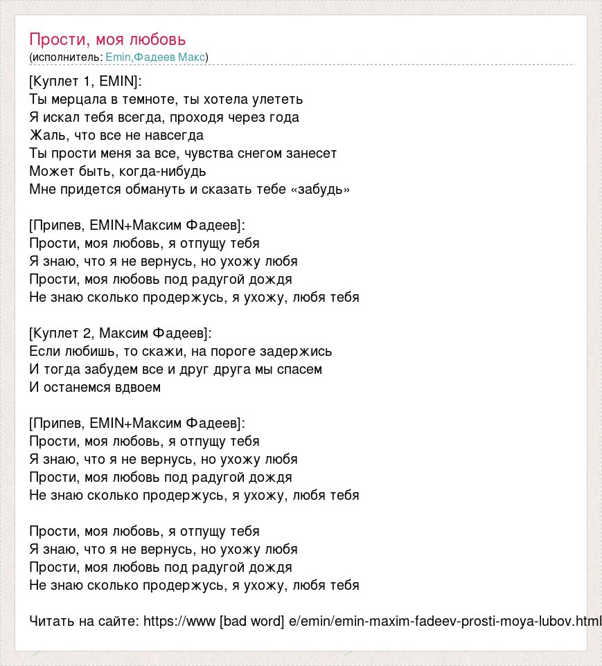 [Куплет 1, EMIN]: Ты мерцала в темноте, ты хотела улететь Я искал тебя всегда, проходя через года Жаль, что все не навсегда Ты прости меня за все, чувства снегом занесет Может быть, когда-нибудь Мне придется обмануть и сказать тебе «забудь» [Припев, EMIN+Максим Фадеев]: Прости, моя любовь, я отпущу тебя Я знаю, что я не вернусь, но ухожу любя Прости, моя любовь под радугой дождя Не знаю сколько продержусь, я ухожу, любя тебя [Куплет 2, Максим Фадеев]: Если любишь, то скажи, на пороге задержись И тогда забудем все и друг друга мы спасем И останемся вдвоем [Припев, EMIN+Максим Фадеев]: Прости, моя любовь, я отпущу тебя Я знаю, что я не вернусь, но ухожу любя Прости, моя любовь под радугой дождя Не знаю сколько продержусь, я ухожу, любя тебя Прости, моя любовь, я отпущу тебя Я знаю, что я не вернусь, но ухожу любя Прости, моя любовь под радугой дождя Не знаю сколько продержусь, я ухожу, любя тебя Читать на сайте: https://www [bad word] e/emin/emin-maxim-fadeev-prosti-moya-lubov.html
