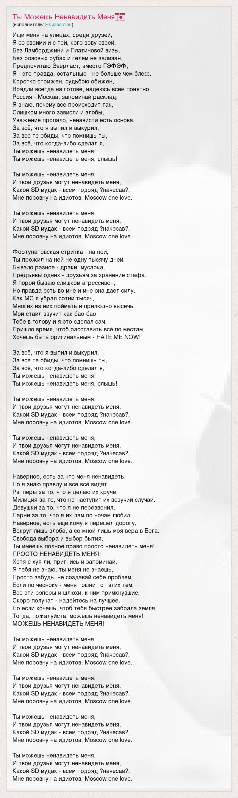 Ищи меня на улицах, среди друзей, Я со своими и с той, кого зову своей. Без Ламборджини и Платиновой визы, Без розовых рубах и гелем не зализан. Предпочитаю Эверласт, вместо ГЭФЭФ, Я - это правда, остальные - не больше чем блеф. Коротко стрижен, судьбою обижен, Врядли всегда на готове, надеюсь всем понятно. Россия - Москва, запоминай расклад, Я знаю, почему все происходит так, Слишком много зависти и злобы, Уважение пропало, ненависти есть основа. За всё, что я выпил и выкурил, За все те обиды, что помнишь ты, За всё, что когда-либо сделал я, Ты можешь ненавидеть меня! Ты можешь ненавидеть меня, слышь! Ты можешь ненавидеть меня, И твои друзья могут ненавидеть меня, Какой SD мудак - всем подряд ?начесав?, Мне поровну на идиотов, Moscow one love. Ты можешь ненавидеть меня, И твои друзья могут ненавидеть меня, Какой SD мудак - всем подряд ?начесав?, Мне поровну на идиотов, Moscow one love. Фортунатовская стритка - на ней, Ты прожил на ней не одну тысячу дней. Бывало разное - драки, мусарка, Предъявы одних - друзьям за хранение стафа. Я порой бываю слишком агрессивен, Но правда есть во мне и мне она дает силу. Как МС я убрал сотни тысяч, Многих из них поймать и прилюдно высечь. Мой стайл звучит как бао-бао Тебе в голову и я это сделал сам. Пришло время, чтоб расставить всё по местам, Хочешь быть оригинальным - HATE ME NOW! За всё, что я выпил и выкурил, За все те обиды, что помнишь ты, За всё, что когда-либо сделал я, Ты можешь ненавидеть меня! Ты можешь ненавидеть меня, слышь! Ты можешь ненавидеть меня, И твои друзья могут ненавидеть меня, Какой SD мудак - всем подряд ?начесав?, Мне поровну на идиотов, Moscow one love. Ты можешь ненавидеть меня, И твои друзья могут ненавидеть меня, Какой SD мудак - всем подряд ?начесав?, Мне поровну на идиотов, Moscow one love. Наверное, есть за что меня ненавидеть, Но я знаю правду и все всё видят. Рэпперы за то, что я делаю их круче, Милиция за то, что не наступит их везучий случай. Девушки за то, что я не перезвонил, Парни за то, что я их дам по ночам любил, Наверное, есть ещё кому я перешел дорогу, Вокруг лишь злоба, а со мной лишь моя вера в Бога. Свобода выбора и выбор бытия, Ты имеешь полное право просто ненавидеть меня! ПРОСТО НЕНАВИДЕТЬ МЕНЯ! Хотя с хуя ли, пригнись и запоминай, Я тебя не знаю, ты меня не знаешь, Просто забудь, не создавай себе проблем, Если по чесноку - меня тошнит от этих тем. Все эти рэперы и шлюхи, к ним примкнувшие, Скоро получат - надейтесь на лучшее. Но если хочешь, чтоб тебя быстрее забрала земля, Тогда, пожалуйста, можешь ненавидеть меня! МОЖЕШЬ НЕНАВИДЕТЬ МЕНЯ! Ты можешь ненавидеть меня, И твои друзья могут ненавидеть меня, Какой SD мудак - всем подряд ?начесав?, Мне поровну на идиотов, Moscow one love. Ты можешь ненавидеть меня, И твои друзья могут ненавидеть меня, Какой SD мудак - всем подряд ?начесав?, Мне поровну на идиотов, Moscow one love. Ты можешь ненавидеть меня, И твои друзья могут ненавидеть меня, Какой SD мудак - всем подряд ?начесав?, Мне поровну на идиотов, Moscow one love. Ты можешь ненавидеть меня, И твои друзья могут ненавидеть меня, Какой SD мудак - всем подряд ?начесав?, Мне поровну на идиотов, Moscow one love.