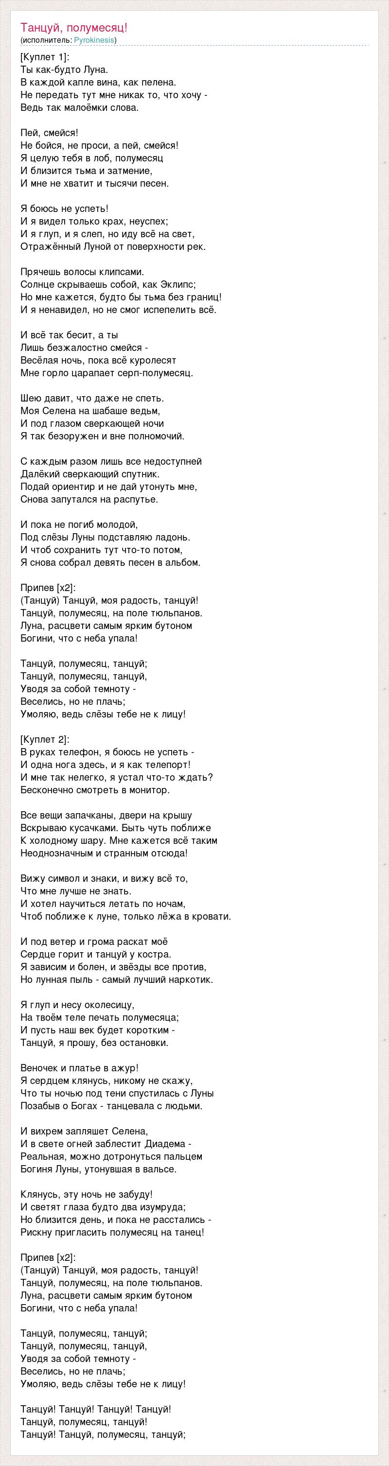 [Куплет 1]: Ты как-будто Луна. В каждой капле вина, как пелена. Не передать тут мне никак то, что хочу - Ведь так малоёмки слова. Пей, смейся! Не бойся, не проси, а пей, смейся! Я целую тебя в лоб, полумесяц И близится тьма и затмение, И мне не хватит и тысячи песен. Я боюсь не успеть! И я видел только крах, неуспех; И я глуп, и я слеп, но иду всё на свет, Отражённый Луной от поверхности рек. Прячешь волосы клипсами. Солнце скрываешь собой, как Эклипс; Но мне кажется, будто бы тьма без границ! И я ненавидел, но не смог испепелить всё. И всё так бесит, а ты Лишь безжалостно смейся - Весёлая ночь, пока всё куролесят Мне горло царапает серп-полумесяц. Шею давит, что даже не спеть. Моя Селена на шабаше ведьм, И под глазом сверкающей ночи Я так безоружен и вне полномочий. С каждым разом лишь все недоступней Далёкий сверкающий спутник. Подай ориентир и не дай утонуть мне, Снова запутался на распутье. И пока не погиб молодой, Под слёзы Луны подставляю ладонь. И чтоб сохранить тут что-то потом, Я снова собрал девять песен в альбом. Припев [x2]: (Танцуй) Танцуй, моя радость, танцуй! Танцуй, полумесяц, на поле тюльпанов. Луна, расцвети самым ярким бутоном Богини, что с неба упала! Танцуй, полумесяц, танцуй; Танцуй, полумесяц, танцуй, Уводя за собой темноту - Веселись, но не плачь; Умоляю, ведь слёзы тебе не к лицу! [Куплет 2]: В руках телефон, я боюсь не успеть - И одна нога здесь, и я как телепорт! И мне так нелегко, я устал что-то ждать? Бесконечно смотреть в монитор. Все вещи запачканы, двери на крышу Вскрываю кусачками. Быть чуть поближе К холодному шару. Мне кажется всё таким Неоднозначным и странным отсюда! Вижу символ и знаки, и вижу всё то, Что мне лучше не знать. И хотел научиться летать по ночам, Чтоб поближе к луне, только лёжа в кровати. И под ветер и грома раскат моё Сердце горит и танцуй у костра. Я зависим и болен, и звёзды все против, Но лунная пыль - самый лучший наркотик. Я глуп и несу околесицу, На твоём теле печать полумесяца; И пусть наш век будет коротким - Танцуй, я прошу, без остановки. Веночек и платье в ажур! Я сердцем клянусь, никому не скажу, Что ты ночью под тени спустилась с Луны Позабыв о Богах - танцевала с людьми. И вихрем запляшет Селена, И в свете огней заблестит Диадема - Реальная, можно дотронуться пальцем Богиня Луны, утонувшая в вальсе. Клянусь, эту ночь не забуду! И светят глаза будто два изумруда; Но близится день, и пока не расстались - Рискну пригласить полумесяц на танец! Припев [x2]: (Танцуй) Танцуй, моя радость, танцуй! Танцуй, полумесяц, на поле тюльпанов. Луна, расцвети самым ярким бутоном Богини, что с неба упала! Танцуй, полумесяц, танцуй; Танцуй, полумесяц, танцуй, Уводя за собой темноту - Веселись, но не плачь; Умоляю, ведь слёзы тебе не к лицу! Танцуй! Танцуй! Танцуй! Танцуй! Танцуй, полумесяц, танцуй! Танцуй! Танцуй, полумесяц, танцуй;
