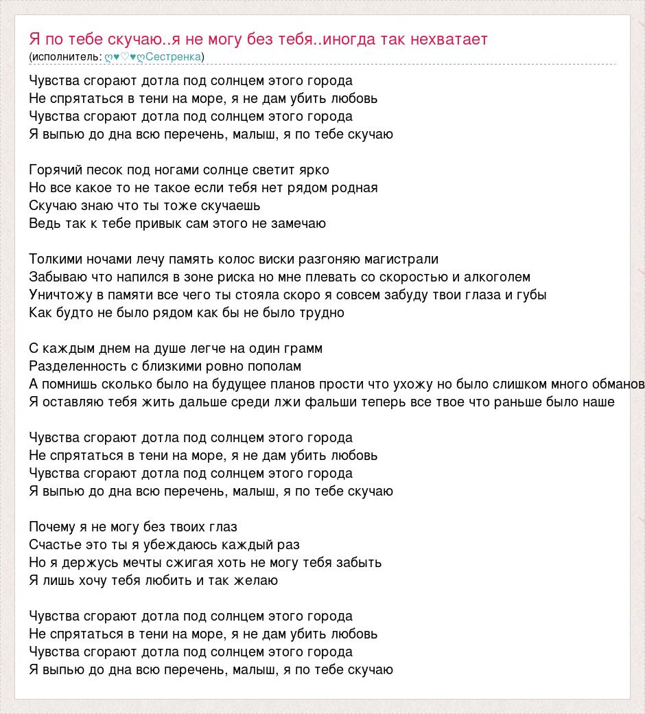 Чувства сгорают дотла под солнцем этого города Не спрятаться в тени на море, я не дам убить любовь Чувства сгорают дотла под солнцем этого города Я выпью до дна всю перечень, малыш, я по тебе скучаю Горячий песок под ногами солнце светит ярко Но все какое то не такое если тебя нет рядом родная Скучаю знаю что ты тоже скучаешь Ведь так к тебе привык сам этого не замечаю Толкими ночами лечу память колос виски разгоняю магистрали Забываю что напился в зоне риска но мне плевать со скоростью и алкоголем Уничтожу в памяти все чего ты стояла скоро я совсем забуду твои глаза и губы Как будто не было рядом как бы не было трудно С каждым днем на душе легче на один грамм Разделенность с близкими ровно пополам А помнишь сколько было на будущее планов прости что ухожу но было слишком много обманов Я оставляю тебя жить дальше среди лжи фальши теперь все твое что раньше было наше Чувства сгорают дотла под солнцем этого города Не спрятаться в тени на море, я не дам убить любовь Чувства сгорают дотла под солнцем этого города Я выпью до дна всю перечень, малыш, я по тебе скучаю Почему я не могу без твоих глаз Счастье это ты я убеждаюсь каждый раз Но я держусь мечты сжигая хоть не могу тебя забыть Я лишь хочу тебя любить и так желаю Чувства сгорают дотла под солнцем этого города Не спрятаться в тени на море, я не дам убить любовь Чувства сгорают дотла под солнцем этого города Я выпью до дна всю перечень, малыш, я по тебе скучаю