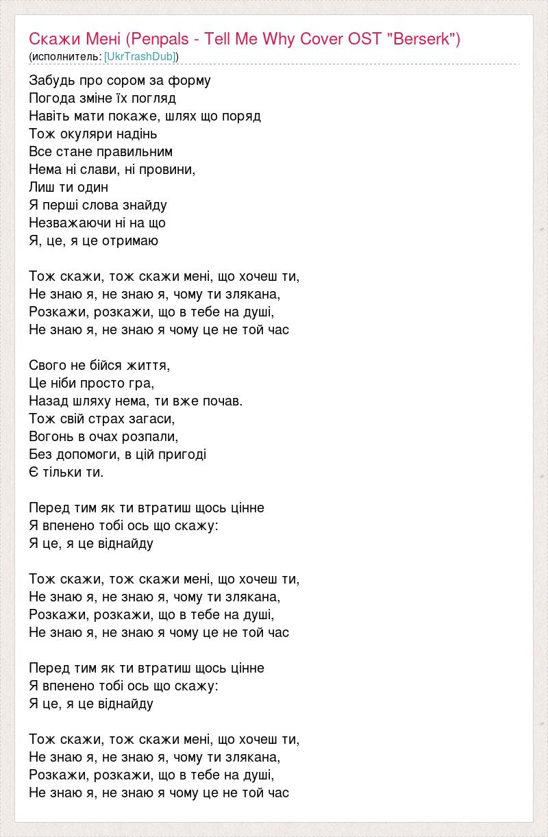 Забудь про сором за форму Погода зміне їх погляд Навіть мати покаже, шлях що поряд Тож окуляри надінь Все стане правильним Нема ні слави, ні провини, Лиш ти один Я перші слова знайду Незважаючи ні на що Я, це, я це отримаю Тож скажи, тож скажи мені, що хочеш ти, Не знаю я, не знаю я, чому ти злякана, Розкажи, розкажи, що в тебе на душі, Не знаю я, не знаю я чому це не той час Свого не бійся життя, Це ніби просто гра, Назад шляху нема, ти вже почав. Тож свій страх загаси, Вогонь в очах розпали, Без допомоги, в цій пригоді Є тільки ти. Перед тим як ти втратиш щось цінне Я впенено тобі ось що скажу: Я це, я це віднайду Тож скажи, тож скажи мені, що хочеш ти, Не знаю я, не знаю я, чому ти злякана, Розкажи, розкажи, що в тебе на душі, Не знаю я, не знаю я чому це не той час Перед тим як ти втратиш щось цінне Я впенено тобі ось що скажу: Я це, я це віднайду Тож скажи, тож скажи мені, що хочеш ти, Не знаю я, не знаю я, чому ти злякана, Розкажи, розкажи, що в тебе на душі, Не знаю я, не знаю я чому це не той час