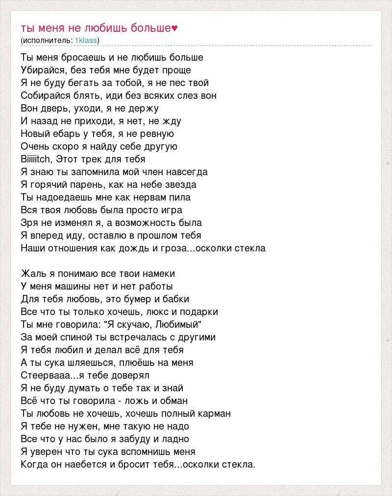 Ты меня бросаешь и не любишь больше Убирайся, без тебя мне будет проще Я не буду бегать за тобой, я не пес твой Собирайся блять, иди без всяких слез вон Вон дверь, уходи, я не держу И назад не приходи, я нет, не жду Новый ебарь у тебя, я не ревную Очень скоро я найду себе другую Biiiiitch, Этот трек для тебя Я знаю ты запомнила мой член навсегда Я горячий парень, как на небе звезда Ты надоедаешь мне как нервам пила Вся твоя любовь была просто игра Зря не изменял я, а возможность была Я вперед иду, оставлю в прошлом тебя Наши отношения как дождь и гроза...осколки стекла Жаль я понимаю все твои намеки У меня машины нет и нет работы Для тебя любовь, это бумер и бабки Все что ты только хочешь, люкс и подарки Ты мне говорила: "Я скучаю, Любимый" За моей спиной ты встречалась с другими Я тебя любил и делал всё для тебя А ты сука шляешься, плюёшь на меня Стеервааа...я тебе доверял Я не буду думать о тебе так и знай Всё что ты говорила - ложь и обман Ты любовь не хочешь, хочешь полный карман Я тебе не нужен, мне такую не надо Все что у нас было я забуду и ладно Я уверен что ты сука вспомнишь меня Когда он наебется и бросит тебя...осколки стекла.