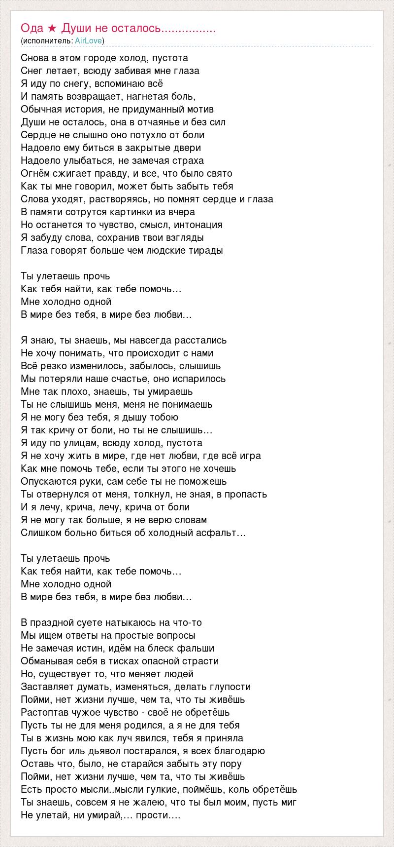 Снова в этом городе холод, пустота Снег летает, всюду забивая мне глаза Я иду по снегу, вспоминаю всё И память возвращает, нагнетая боль, Обычная история, не придуманный мотив Души не осталось, она в отчаянье и без сил Сердце не слышно оно потухло от боли Надоело ему биться в закрытые двери Надоело улыбаться, не замечая страха Огнём сжигает правду, и все, что было свято Как ты мне говорил, может быть забыть тебя Слова уходят, растворяясь, но помнят сердце и глаза В памяти сотрутся картинки из вчера Но останется то чувство, смысл, интонация Я забуду слова, сохранив твои взгляды Глаза говорят больше чем людские тирады Ты улетаешь прочь Как тебя найти, как тебе помочь… Мне холодно одной В мире без тебя, в мире без любви… Я знаю, ты знаешь, мы навсегда расстались Не хочу понимать, что происходит с нами Всё резко изменилось, забылось, слышишь Мы потеряли наше счастье, оно испарилось Мне так плохо, знаешь, ты умираешь Ты не слышишь меня, меня не понимаешь Я не могу без тебя, я дышу тобою Я так кричу от боли, но ты не слышишь… Я иду по улицам, всюду холод, пустота Я не хочу жить в мире, где нет любви, где всё игра Как мне помочь тебе, если ты этого не хочешь Опускаются руки, сам себе ты не поможешь Ты отвернулся от меня, толкнул, не зная, в пропасть И я лечу, крича, лечу, крича от боли Я не могу так больше, я не верю словам Слишком больно биться об холодный асфальт… Ты улетаешь прочь Как тебя найти, как тебе помочь… Мне холодно одной В мире без тебя, в мире без любви… В праздной суете натыкаюсь на что-то Мы ищем ответы на простые вопросы Не замечая истин, идём на блеск фальши Обманывая себя в тисках опасной страсти Но, существует то, что меняет людей Заставляет думать, изменяться, делать глупости Пойми, нет жизни лучше, чем та, что ты живёшь Растоптав чужое чувство - своё не обретёшь Пусть ты не для меня родился, а я не для тебя Ты в жизнь мою как луч явился, тебя я приняла Пусть бог иль дьявол постарался, я всех благодарю Оставь что, было, не старайся забыть эту пору Пойми, нет жизни лучше, чем та, что ты живёшь Есть просто мысли..мысли гулкие, поймёшь, коль обретёшь Ты знаешь, совсем я не жалею, что ты был моим, пусть миг Не улетай, ни умирай,… прости….
