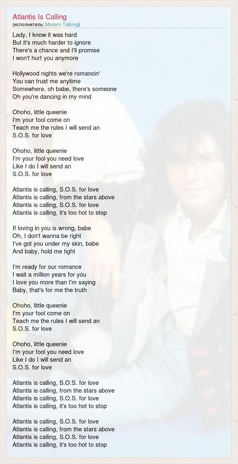 Lady, I know it was hard But it's much harder to ignore There's a chance and I'll promise I won't hurt you anymore Hollywood nights we're romancin' You can trust me anytime Somewhere, oh babe, there's someone Oh you're dancing in my mind Ohoho, little queenie I'm your fool come on Teach me the rules I will send an S.O.S. for love Ohoho, little queenie I'm your fool you need love Like I do I will send an S.O.S. for love Atlantis is calling, S.O.S. for love Atlantis is calling, from the stars above Atlantis is calling, S.O.S. for love Atlantis is calling, it's too hot to stop If loving in you is wrong, babe Oh, I don't wanna be right I've got you under my skin, babe And baby, hold me tight I'm ready for our romance I wait a million years for you I love you more than I'm saying Baby, that's for me the truth Ohoho, little queenie I'm your fool come on Teach me the rules I will send an S.O.S. for love Ohoho, little queenie I'm your fool you need love Like I do I will send an S.O.S. for love Atlantis is calling, S.O.S. for love Atlantis is calling, from the stars above Atlantis is calling, S.O.S. for love Atlantis is calling, it's too hot to stop Atlantis is calling, S.O.S. for love Atlantis is calling, from the stars above Atlantis is calling, S.O.S. for love Atlantis is calling, it's too hot to stop