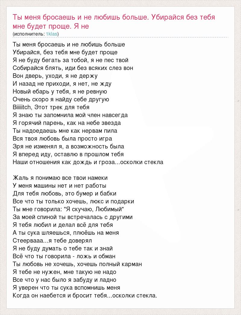 Ты меня бросаешь и не любишь больше Убирайся, без тебя мне будет проще Я не буду бегать за тобой, я не пес твой Собирайся блять, иди без всяких слез вон Вон дверь, уходи, я не держу И назад не приходи, я нет, не жду Новый ебарь у тебя, я не ревную Очень скоро я найду себе другую Biiiiitch, Этот трек для тебя Я знаю ты запомнила мой член навсегда Я горячий парень, как на небе звезда Ты надоедаешь мне как нервам пила Вся твоя любовь была просто игра Зря не изменял я, а возможность была Я вперед иду, оставлю в прошлом тебя Наши отношения как дождь и гроза...осколки стекла Жаль я понимаю все твои намеки У меня машины нет и нет работы Для тебя любовь, это бумер и бабки Все что ты только хочешь, люкс и подарки Ты мне говорила: "Я скучаю, Любимый" За моей спиной ты встречалась с другими Я тебя любил и делал всё для тебя А ты сука шляешься, плюёшь на меня Стеервааа...я тебе доверял Я не буду думать о тебе так и знай Всё что ты говорила - ложь и обман Ты любовь не хочешь, хочешь полный карман Я тебе не нужен, мне такую не надо Все что у нас было я забуду и ладно Я уверен что ты сука вспомнишь меня Когда он наебется и бросит тебя...осколки стекла.