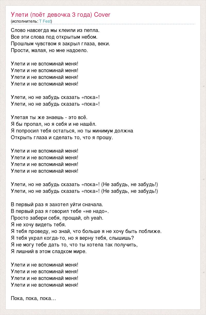 Слово навсегда мы клеили из пепла. Все эти слова под открытым небом. Прошлым чувством я закрыл глаза, веки. Прости, малая, но мне надоело. Улети и не вспоминай меня! Улети и не вспоминай меня! Улети и не вспоминай меня! Улети и не вспоминай меня! Улети, но не забудь сказать «пока»! Улети, но не забудь сказать «пока»! Улетая ты же знаешь - это всё. Я бы пропал, но я себя и не нашёл. Я попросил тебя остаться, но ты минимум должна Открыть глаза и сделать то, что я прошу. Улети и не вспоминай меня! Улети и не вспоминай меня! Улети и не вспоминай меня! Улети и не вспоминай меня! Улети, но не забудь сказать «пока»! (Не забудь, не забудь!) Улети, но не забудь сказать «пока»! (Не забудь, не забудь!) В первый раз я захотел уйти сначала. В первый раз я говорил тебе «не надо». Просто забери себя, прощай, oh yeah. Я не хочу видеть тебя. Я тебя проведу, но знай, что больше я не хочу быть поближе. Я тебя украл когда-то, но я верну тебя, слышишь? Я не могу тебе дать то, что ты хотела так получить, Я лишний в этом сладком мире. Улети и не вспоминай меня! Улети и не вспоминай меня! Улети и не вспоминай меня! Улети и не вспоминай меня! Пока, пока, пока…