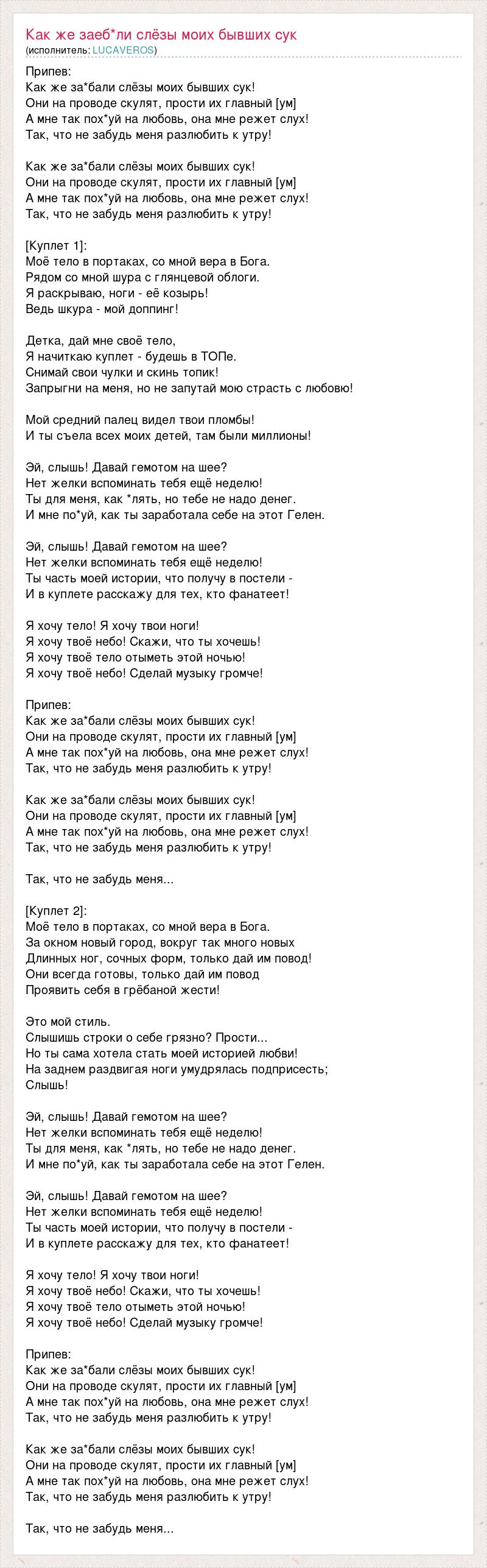 Припев: Как же за*бали слёзы моих бывших сук! Они на проводе скулят, прости их главный [ум] А мне так пох*уй на любовь, она мне режет слух! Так, что не забудь меня разлюбить к утру! Как же за*бали слёзы моих бывших сук! Они на проводе скулят, прости их главный [ум] А мне так пох*уй на любовь, она мне режет слух! Так, что не забудь меня разлюбить к утру! [Куплет 1]: Моё тело в портаках, со мной вера в Бога. Рядом со мной шура с глянцевой облоги. Я раскрываю, ноги - её козырь! Ведь шкура - мой доппинг! Детка, дай мне своё тело, Я начиткаю куплет - будешь в ТОПе. Снимай свои чулки и скинь топик! Запрыгни на меня, но не запутай мою страсть с любовю! Мой средний палец видел твои пломбы! И ты съела всех моих детей, там были миллионы! Эй, слышь! Давай гемотом на шее? Нет желки вспоминать тебя ещё неделю! Ты для меня, как *лять, но тебе не надо денег. И мне по*уй, как ты заработала себе на этот Гелен. Эй, слышь! Давай гемотом на шее? Нет желки вспоминать тебя ещё неделю! Ты часть моей истории, что получу в постели - И в куплете расскажу для тех, кто фанатеет! Я хочу тело! Я хочу твои ноги! Я хочу твоё небо! Скажи, что ты хочешь! Я хочу твоё тело отыметь этой ночью! Я хочу твоё небо! Сделай музыку громче! Припев: Как же за*бали слёзы моих бывших сук! Они на проводе скулят, прости их главный [ум] А мне так пох*уй на любовь, она мне режет слух! Так, что не забудь меня разлюбить к утру! Как же за*бали слёзы моих бывших сук! Они на проводе скулят, прости их главный [ум] А мне так пох*уй на любовь, она мне режет слух! Так, что не забудь меня разлюбить к утру! Так, что не забудь меня... [Куплет 2]: Моё тело в портаках, со мной вера в Бога. За окном новый город, вокруг так много новых Длинных ног, сочных форм, только дай им повод! Они всегда готовы, только дай им повод Проявить себя в грёбаной жести! Это мой стиль. Слышишь строки о себе грязно? Прости... Но ты сама хотела стать моей историей любви! На заднем раздвигая ноги умудрялась подприсесть; Слышь! Эй, слышь! Давай гемотом на шее? Нет желки вспоминать тебя ещё неделю! Ты для меня, как *лять, но тебе не надо денег. И мне по*уй, как ты заработала себе на этот Гелен. Эй, слышь! Давай гемотом на шее? Нет желки вспоминать тебя ещё неделю! Ты часть моей истории, что получу в постели - И в куплете расскажу для тех, кто фанатеет! Я хочу тело! Я хочу твои ноги! Я хочу твоё небо! Скажи, что ты хочешь! Я хочу твоё тело отыметь этой ночью! Я хочу твоё небо! Сделай музыку громче! Припев: Как же за*бали слёзы моих бывших сук! Они на проводе скулят, прости их главный [ум] А мне так пох*уй на любовь, она мне режет слух! Так, что не забудь меня разлюбить к утру! Как же за*бали слёзы моих бывших сук! Они на проводе скулят, прости их главный [ум] А мне так пох*уй на любовь, она мне режет слух! Так, что не забудь меня разлюбить к утру! Так, что не забудь меня...