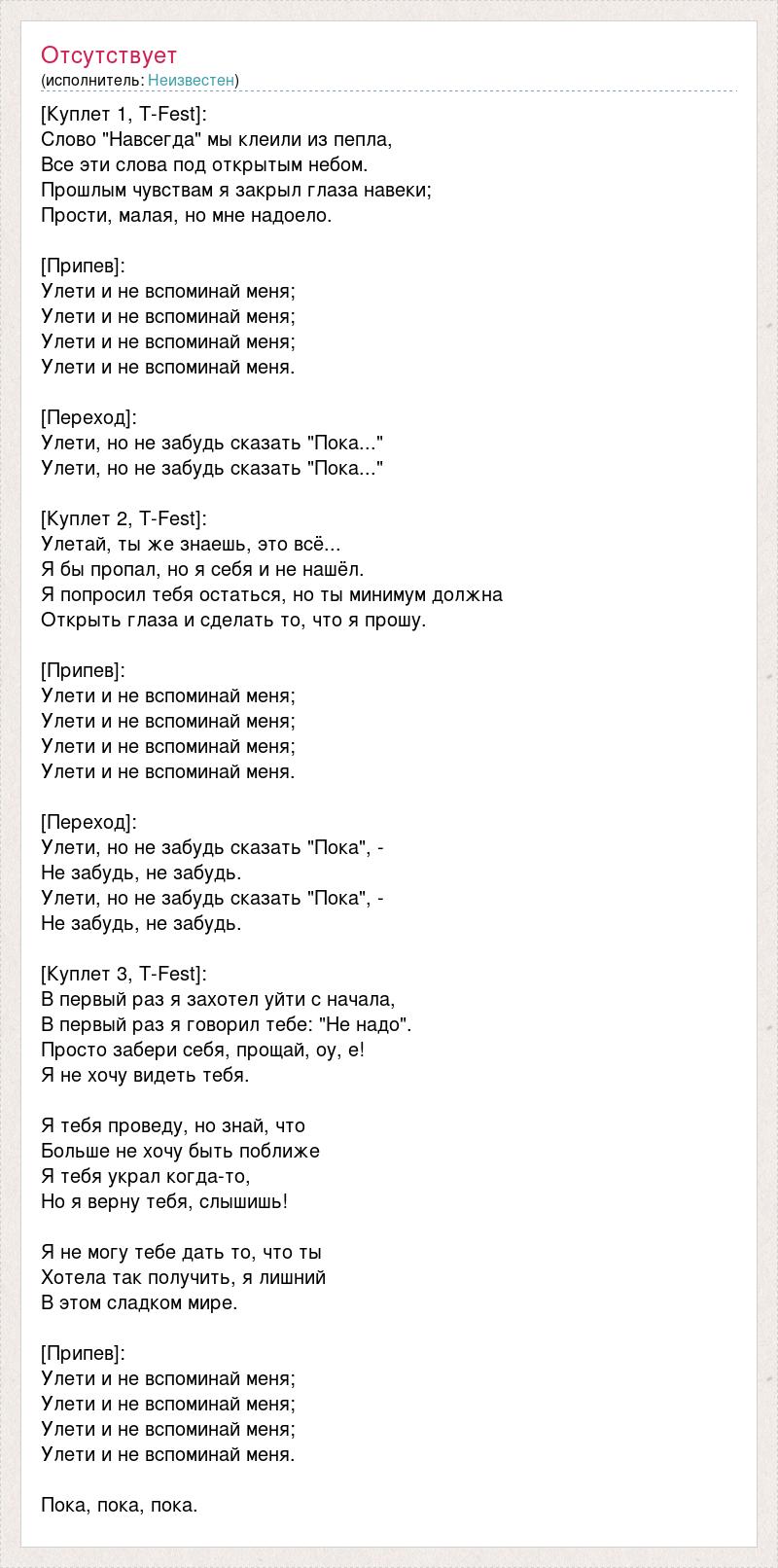[Куплет 1, T-Fest]: Слово "Навсегда" мы клеили из пепла, Все эти слова под открытым небом. Прошлым чувствам я закрыл глаза навеки; Прости, малая, но мне надоело. [Припев]: Улети и не вспоминай меня; Улети и не вспоминай меня; Улети и не вспоминай меня; Улети и не вспоминай меня. [Переход]: Улети, но не забудь сказать "Пока..." Улети, но не забудь сказать "Пока..." [Куплет 2, T-Fest]: Улетай, ты же знаешь, это всё... Я бы пропал, но я себя и не нашёл. Я попросил тебя остаться, но ты минимум должна Открыть глаза и сделать то, что я прошу. [Припев]: Улети и не вспоминай меня; Улети и не вспоминай меня; Улети и не вспоминай меня; Улети и не вспоминай меня. [Переход]: Улети, но не забудь сказать "Пока", - Не забудь, не забудь. Улети, но не забудь сказать "Пока", - Не забудь, не забудь. [Куплет 3, T-Fest]: В первый раз я захотел уйти с начала, В первый раз я говорил тебе: "Не надо". Просто забери себя, прощай, оу, е! Я не хочу видеть тебя. Я тебя проведу, но знай, что Больше не хочу быть поближе Я тебя украл когда-то, Но я верну тебя, слышишь! Я не могу тебе дать то, что ты Хотела так получить, я лишний В этом сладком мире. [Припев]: Улети и не вспоминай меня; Улети и не вспоминай меня; Улети и не вспоминай меня; Улети и не вспоминай меня. Пока, пока, пока.
