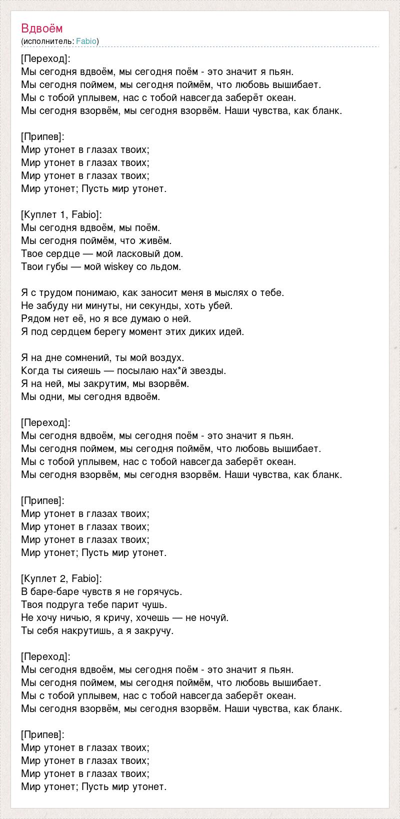 [Переход]: Мы сегодня вдвоём, мы сегодня поём - это значит я пьян. Мы сегодня поймем, мы сегодня поймём, что любовь вышибает. Мы с тобой уплывем, нас с тобой навсегда заберёт океан. Мы сегодня взорвём, мы сегодня взорвём. Наши чувства, как бланк. [Припев]: Мир утонет в глазах твоих; Мир утонет в глазах твоих; Мир утонет в глазах твоих; Мир утонет; Пусть мир утонет. [Куплет 1, Fabio]: Мы сегодня вдвоём, мы поём. Мы сегодня поймём, что живём. Твое сердце — мой ласковый дом. Твои губы — мой wiskey со льдом. Я с трудом понимаю, как заносит меня в мыслях о тебе. Не забуду ни минуты, ни секунды, хоть убей. Рядом нет её, но я все думаю о ней. Я под сердцем берегу момент этих диких идей. Я на дне сомнений, ты мой воздух. Когда ты сияешь — посылаю нах*й звезды. Я на ней, мы закрутим, мы взорвём. Мы одни, мы сегодня вдвоём. [Переход]: Мы сегодня вдвоём, мы сегодня поём - это значит я пьян. Мы сегодня поймем, мы сегодня поймём, что любовь вышибает. Мы с тобой уплывем, нас с тобой навсегда заберёт океан. Мы сегодня взорвём, мы сегодня взорвём. Наши чувства, как бланк. [Припев]: Мир утонет в глазах твоих; Мир утонет в глазах твоих; Мир утонет в глазах твоих; Мир утонет; Пусть мир утонет. [Куплет 2, Fabio]: В баре-баре чувств я не горячусь. Твоя подруга тебе парит чушь. Не хочу ничью, я кричу, хочешь — не ночуй. Ты себя накрутишь, а я закручу. [Переход]: Мы сегодня вдвоём, мы сегодня поём - это значит я пьян. Мы сегодня поймем, мы сегодня поймём, что любовь вышибает. Мы с тобой уплывем, нас с тобой навсегда заберёт океан. Мы сегодня взорвём, мы сегодня взорвём. Наши чувства, как бланк. [Припев]: Мир утонет в глазах твоих; Мир утонет в глазах твоих; Мир утонет в глазах твоих; Мир утонет; Пусть мир утонет.