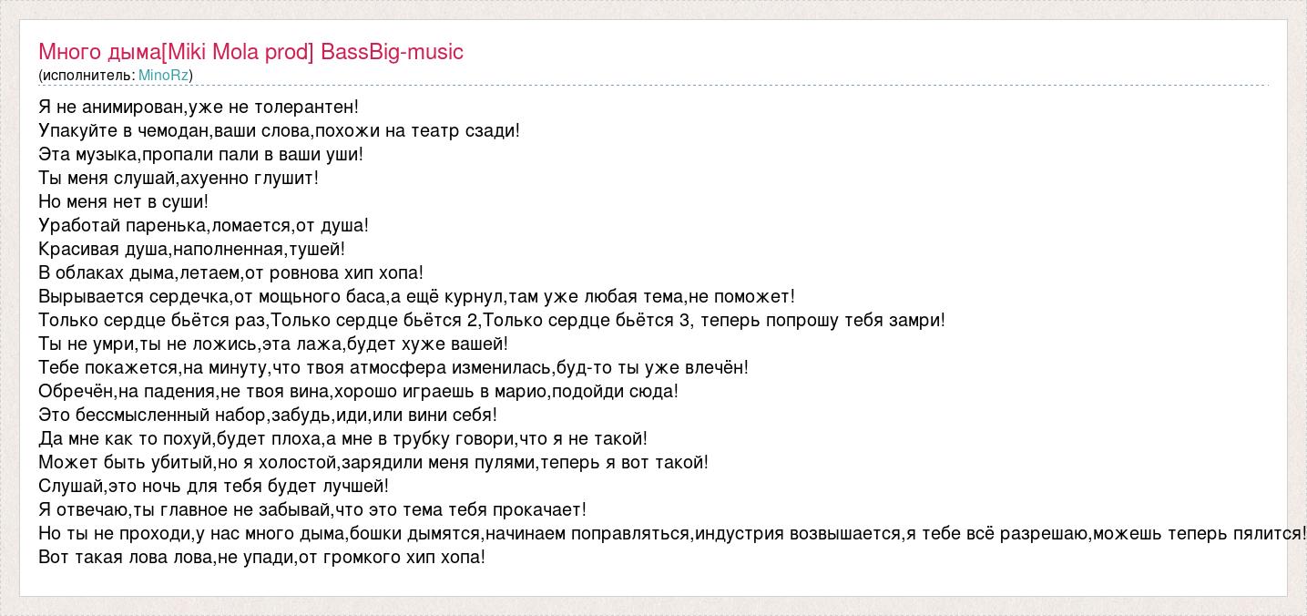 Я не анимирован,уже не толерантен! Упакуйте в чемодан,ваши слова,похожи на театр сзади! Эта музыка,пропали пали в ваши уши! Ты меня слушай,ахуенно глушит! Но меня нет в суши! Уработай паренька,ломается,от душа! Красивая душа,наполненная,тушей! В облаках дыма,летаем,от ровнова хип хопа! Вырывается сердечка,от мощьного баса,а ещё курнул,там уже любая тема,не поможет! Только сердце бьётся раз,Только сердце бьётся 2,Только сердце бьётся 3, теперь попрошу тебя замри! Ты не умри,ты не ложись,эта лажа,будет хуже вашей! Тебе покажется,на минуту,что твоя атмосфера изменилась,буд-то ты уже влечён! Обречён,на падения,не твоя вина,хорошо играешь в марио,подойди сюда! Это бессмысленный набор,забудь,иди,или вини себя! Да мне как то похуй,будет плоха,а мне в трубку говори,что я не такой! Может быть убитый,но я холостой,зарядили меня пулями,теперь я вот такой! Слушай,это ночь для тебя будет лучшей! Я отвечаю,ты главное не забывай,что это тема тебя прокачает! Но ты не проходи,у нас много дыма,бошки дымятся,начинаем поправляться,индустрия возвышается,я тебе всё разрешаю,можешь теперь пялится! Вот такая лова лова,не упади,от громкого хип хопа!