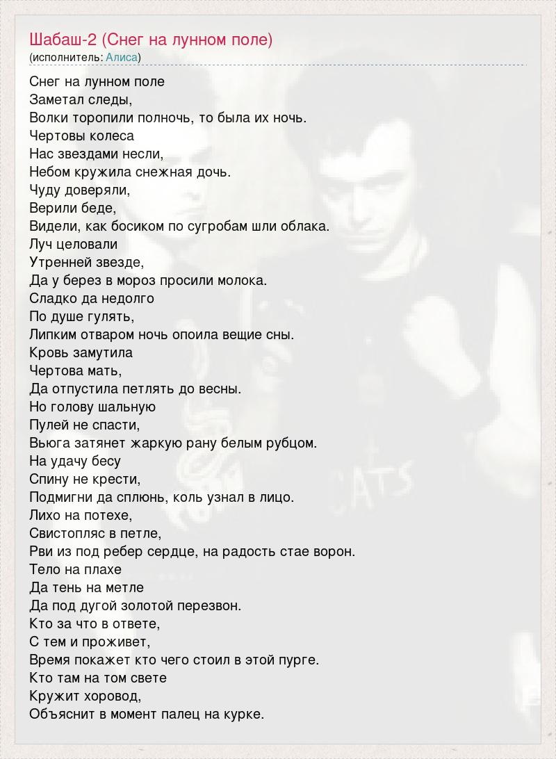 Снег на лунном поле Заметал следы, Волки торопили полночь, то была их ночь. Чертовы колеса Нас звездами несли, Небом кружила снежная дочь. Чуду доверяли, Верили беде, Видели, как босиком по сугробам шли облака. Луч целовали Утренней звезде, Да у берез в мороз просили молока. Сладко да недолго По душе гулять, Липким отваром ночь опоила вещие сны. Кровь замутила Чертова мать, Да отпустила петлять до весны. Но голову шальную Пулей не спасти, Вьюга затянет жаркую рану белым рубцом. На удачу бесу Спину не крести, Подмигни да сплюнь, коль узнал в лицо. Лихо на потехе, Свистопляс в петле, Рви из под ребер сердце, на радость стае ворон. Тело на плахе Да тень на метле Да под дугой золотой перезвон. Кто за что в ответе, С тем и проживет, Время покажет кто чего стоил в этой пурге. Кто там на том свете Кружит хоровод, Объяснит в момент палец на курке.