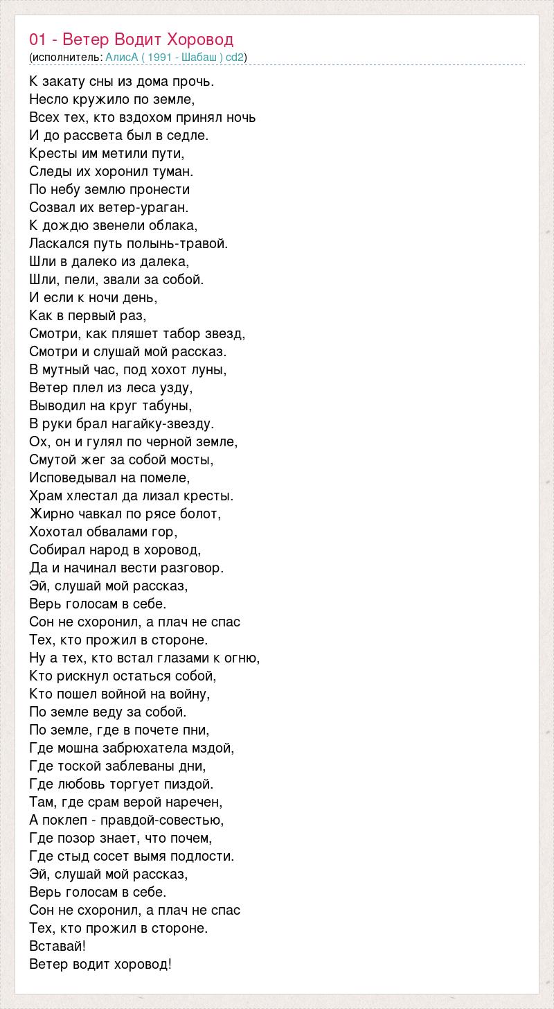 К закату сны из дома прочь. Несло кружило по земле, Всех тех, кто вздохом принял ночь И до рассвета был в седле. Кресты им метили пути, Следы их хоронил туман. По небу землю пронести Созвал их ветер-ураган. К дождю звенели облака, Ласкался путь полынь-травой. Шли в далеко из далека, Шли, пели, звали за собой. И если к ночи день, Как в первый раз, Смотри, как пляшет табор звезд, Смотри и слушай мой рассказ. В мутный час, под хохот луны, Ветер плел из леса узду, Выводил на круг табуны, В руки брал нагайку-звезду. Ох, он и гулял по черной земле, Смутой жег за собой мосты, Исповедывал на помеле, Храм хлестал да лизал кресты. Жирно чавкал по рясе болот, Хохотал обвалами гор, Собирал народ в хоровод, Да и начинал вести разговор. Эй, слушай мой рассказ, Верь голосам в себе. Сон не схоронил, а плач не спас Тех, кто прожил в стороне. Ну а тех, кто встал глазами к огню, Кто рискнул остаться собой, Кто пошел войной на войну, По земле веду за собой. По земле, где в почете пни, Где мошна забрюхатела мздой, Где тоской заблеваны дни, Где любовь торгует пиздой. Там, где срам верой наречен, А поклеп - правдой-совестью, Где позор знает, что почем, Где стыд сосет вымя подлости. Эй, слушай мой рассказ, Верь голосам в себе. Сон не схоронил, а плач не спас Тех, кто прожил в стороне. Вставай! Ветер водит хоровод!