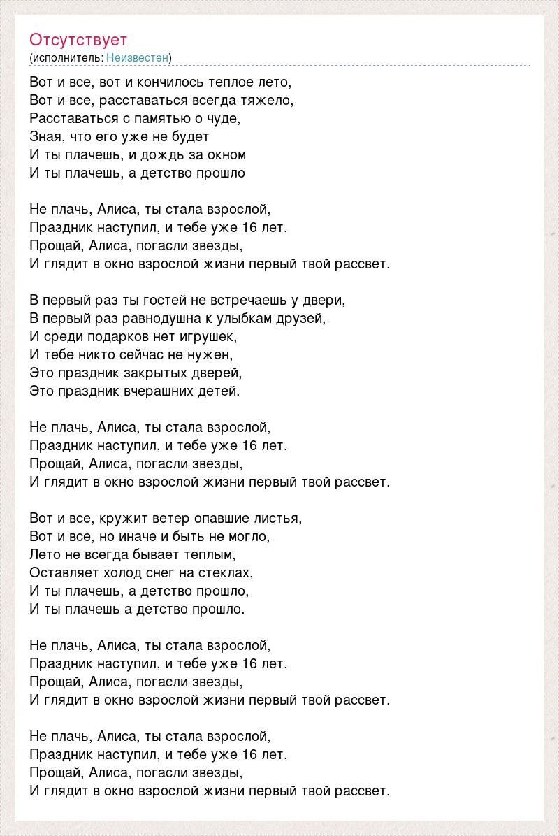 Вот и все, вот и кончилось теплое лето, Вот и все, расставаться всегда тяжело, Расставаться с памятью о чуде, Зная, что его уже не будет И ты плачешь, и дождь за окном И ты плачешь, а детство прошло Не плачь, Алиса, ты стала взрослой, Праздник наступил, и тебе уже 16 лет. Прощай, Алиса, погасли звезды, И глядит в окно взрослой жизни первый твой рассвет. В первый раз ты гостей не встречаешь у двери, В первый раз равнодушна к улыбкам друзей, И среди подарков нет игрушек, И тебе никто сейчас не нужен, Это праздник закрытых дверей, Это праздник вчерашних детей. Не плачь, Алиса, ты стала взрослой, Праздник наступил, и тебе уже 16 лет. Прощай, Алиса, погасли звезды, И глядит в окно взрослой жизни первый твой рассвет. Вот и все, кружит ветер опавшие листья, Вот и все, но иначе и быть не могло, Лето не всегда бывает теплым, Оставляет холод снег на стеклах, И ты плачешь, а детство прошло, И ты плачешь а детство прошло. Не плачь, Алиса, ты стала взрослой, Праздник наступил, и тебе уже 16 лет. Прощай, Алиса, погасли звезды, И глядит в окно взрослой жизни первый твой рассвет. Не плачь, Алиса, ты стала взрослой, Праздник наступил, и тебе уже 16 лет. Прощай, Алиса, погасли звезды, И глядит в окно взрослой жизни первый твой рассвет.