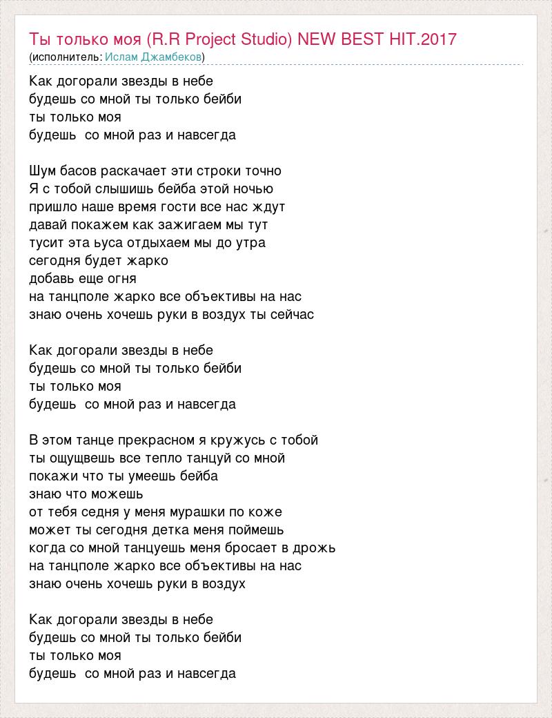 Как догорали звезды в небе будешь со мной ты только бейби ты только моя будешь со мной раз и навсегда Шум басов раскачает эти строки точно Я с тобой слышишь бейба этой ночью пришло наше время гости все нас ждут давай покажем как зажигаем мы тут тусит эта ьуса отдыхаем мы до утра сегодня будет жарко добавь еще огня на танцполе жарко все объективы на нас знаю очень хочешь руки в воздух ты сейчас Как догорали звезды в небе будешь со мной ты только бейби ты только моя будешь со мной раз и навсегда В этом танце прекрасном я кружусь с тобой ты ощущвешь все тепло танцуй со мной покажи что ты умеешь бейба знаю что можешь от тебя седня у меня мурашки по коже может ты сегодня детка меня поймешь когда со мной танцуешь меня бросает в дрожь на танцполе жарко все объективы на нас знаю очень хочешь руки в воздух Как догорали звезды в небе будешь со мной ты только бейби ты только моя будешь со мной раз и навсегда