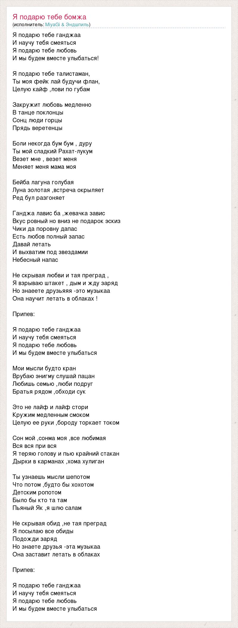 Я подарю тебе ганджаа И научу тебя смеяться Я подарю тебе любовь И мы будем вместе улыбаться! Я подарю тебе талистаман, Ты моя фейк лай будучи флан, Целую кайф ,лови по губам Закружит любовь медленно В танце поклонцы Сонц люди горцы Прядь веретенцы Боли некогда бум бум , дуру Ты мой сладкий Рахат-лукум Везет мне , везет меня Меняет меня мама моя Бейба лагуна голубая Луна золотая ,встреча окрыляет Ред бул разгоняет Ганджа лавис ба ,жевачка завис Вкус ровный но вниз не подарок эскиз Чики да поровну дапас Есть любов полный запас Давай летать И выхватим под звездамии Небесный напас Не скрывая любви и тая преград , Я взрываю штакет , дым и жду заряд Но знаеете друзьяяя -это музыкаа Она научит летать в облаках ! Припев: Я подарю тебе ганджаа И научу тебя смеяться Я подарю тебе любовь И мы будем вместе улыбаться Мои мысли будто кран Врубаю энигму слушай пацан Любишь семью ,люби подруг Братья рядом ,обходи сук Это не лайф и лайф стори Кружим медленным смоком Целую ее руки ,бороду торкает током Сон мой ,сонма моя ,все любимая Вся вся при вся Я теряю голову и пью крайний стакан Дырки в карманах ,хома хулиган Ты узнаешь мысли шепотом Что потом ,будто бы хохотом Детским ропотом Было бы кто та там Пьяный Як ,я шлю салам Не скрывая обид ,не тая преград Я посылаю все обиды Подожди заряд Но знаете друзья -эта музыкаа Она заставит летать в облаках Припев: Я подарю тебе ганджаа И научу тебя смеяться Я подарю тебе любовь И мы будем вместе улыбаться