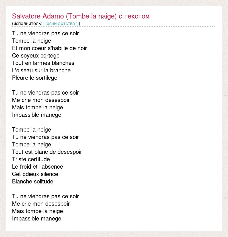 Tu ne viendras pas ce soir Tombe la neige Et mon coeur s'habille de noir Ce soyeux cortege Tout en larmes blanches L'oiseau sur la branche Pleure le sortilege Tu ne viendras pas ce soir Me crie mon desespoir Mais tombe la neige Impassible manege Tombe la neige Tu ne viendras pas ce soir Tombe la neige Tout est blanc de desespoir Triste certitude Le froid et l'absence Cet odieux silence Blanche solitude Tu ne viendras pas ce soir Me crie mon desespoir Mais tombe la neige Impassible manege