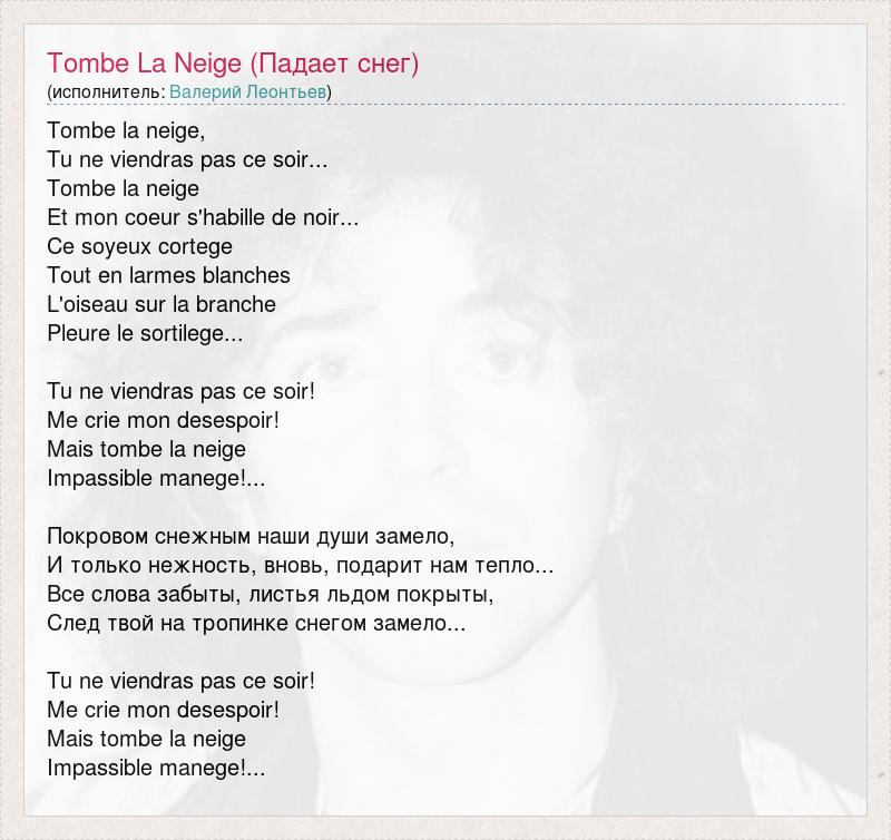 Tombe la neige, Tu ne viendras pas ce soir... Tombe la neige Et mon coeur s'habille de noir... Ce soyeux cortege Tout en larmes blanches L'oiseau sur la branche Pleure le sortilege... Tu ne viendras pas ce soir! Me crie mon desespoir! Mais tombe la neige Impassible manege!... Покровом снежным наши души замело, И только нежность, вновь, подарит нам тепло... Все слова забыты, листья льдом покрыты, След твой на тропинке снегом замело... Tu ne viendras pas ce soir! Me crie mon desespoir! Mais tombe la neige Impassible manege!...