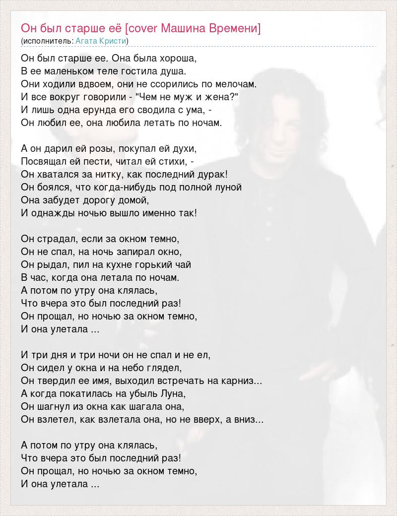 Он был старше ее. Она была хороша, В ее маленьком теле гостила душа. Они ходили вдвоем, они не ссорились по мелочам. И все вокруг говорили - "Чем не муж и жена?" И лишь одна ерунда его сводила с ума, - Он любил ее, она любила летать по ночам. А он дарил ей розы, покупал ей духи, Посвящал ей пести, читал ей стихи, - Он хватался за нитку, как последний дурак! Он боялся, что когда-нибудь под полной луной Она забудет дорогу домой, И однажды ночью вышло именно так! Он страдал, если за окном темно, Он не спал, на ночь запирал окно, Он рыдал, пил на кухне горький чай В час, когда она летала по ночам. А потом по утру она клялась, Что вчера это был последний раз! Он прощал, но ночью за окном темно, И она улетала ... И три дня и три ночи он не спал и не ел, Он сидел у окна и на небо глядел, Он твердил ее имя, выходил встречать на карниз... А когда покатилась на убыль Луна, Он шагнул из окна как шагала она, Он взлетел, как взлетала она, но не вверх, а вниз... А потом по утру она клялась, Что вчера это был последний раз! Он прощал, но ночью за окном темно, И она улетала ...