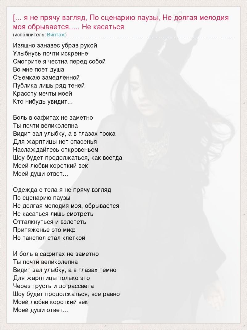 Изящно занавес убрав рукой Улыбнусь почти искренне Смотрите я честна перед собой Во мне поет душа Съемкаю замедленной Публика лишь ряд теней Красоту мечты моей Кто нибудь увидит... Боль в сафитах не заметно Ты почти великолепна Видит зал улыбку, а в глазах тоска Для жарптицы нет спасенья Наслаждайтесь откровеньем Шоу будет продолжаться, как всегда Моей любви короткий век Моей души ответ... Одежда с тела я не прячу взгляд По сценарию паузы Не долгая мелодия моя, обрывается Не касаться лишь смотреть Отталкнуться и взлететь Притяженье это миф Но танспол стал клеткой И боль в сафитах не заметно Ты почти великолепна Видит зал улыбку, а в глазах темно Для жарптицы только это Через грусть и до рассвета Шоу будет продолжаться, все равно Моей любви короткий век Моей души ответ...