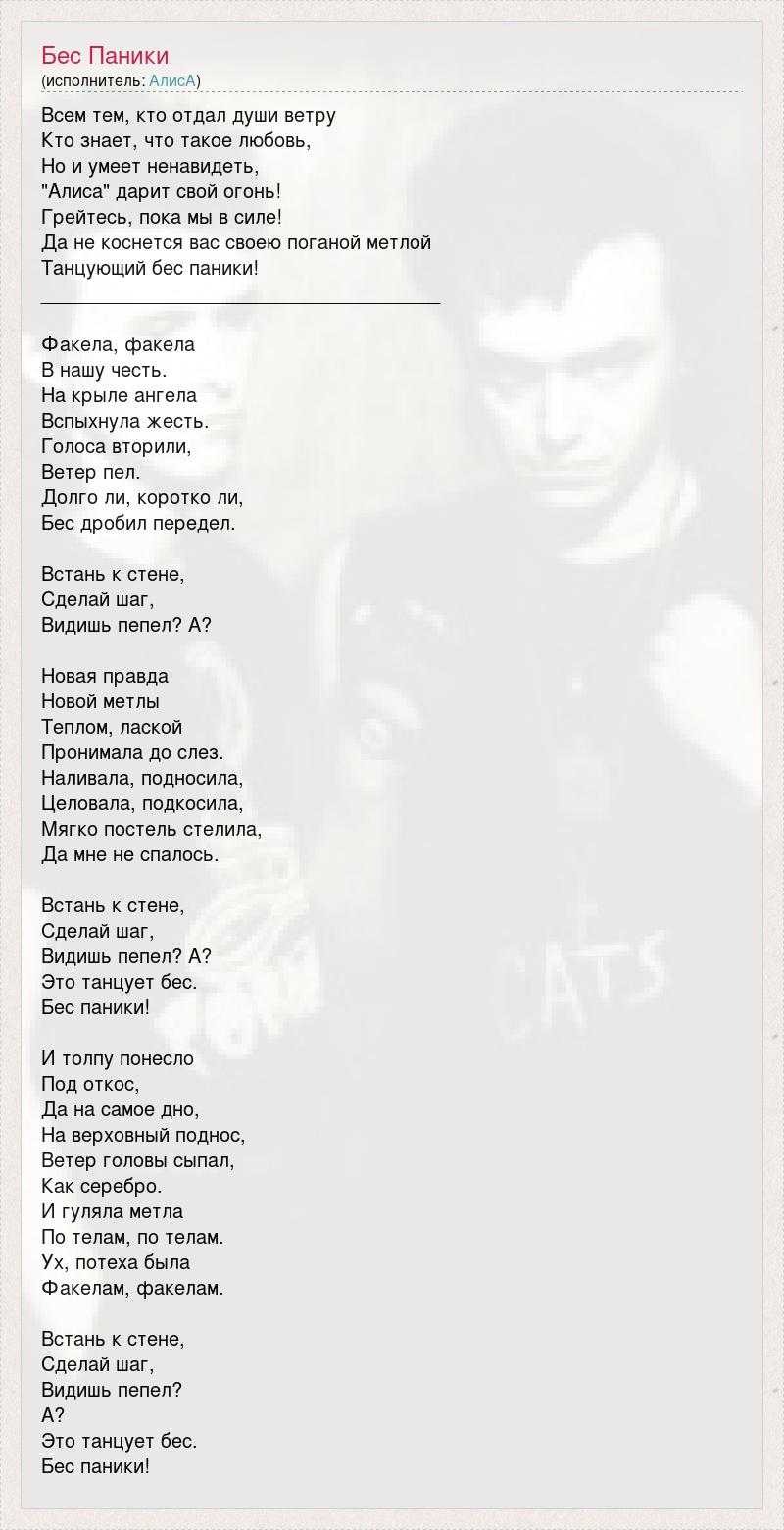 Всем тем, кто отдал души ветру Кто знает, что такое любовь, Но и умеет ненавидеть, "Алиса" дарит свой огонь! Грейтесь, пока мы в силе! Да не коснется вас своею поганой метлой Танцующий бес паники! _____________________________________ Факела, факела В нашу честь. На крыле ангела Вспыхнула жесть. Голоса вторили, Ветер пел. Долго ли, коротко ли, Бес дробил передел. Встань к стене, Сделай шаг, Видишь пепел? А? Новая правда Новой метлы Теплом, лаской Пронимала до слез. Наливала, подносила, Целовала, подкосила, Мягко постель стелила, Да мне не спалось. Встань к стене, Сделай шаг, Видишь пепел? А? Это танцует бес. Бес паники! И толпу понесло Под откос, Да на самое дно, На верховный поднос, Ветер головы сыпал, Как серебро. И гуляла метла По телам, по телам. Ух, потеха была Факелам, факелам. Встань к стене, Сделай шаг, Видишь пепел? А? Это танцует бес. Бес паники!
