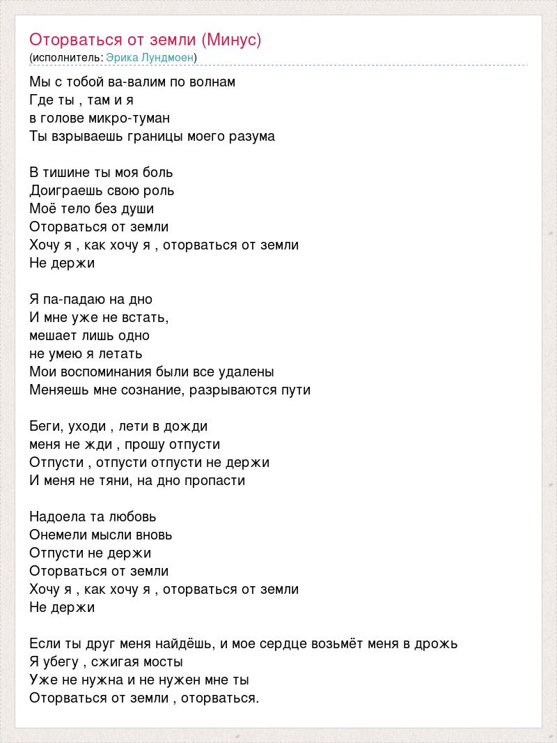Мы с тобой ва-валим по волнам Где ты , там и я в голове микро-туман Ты взрываешь границы моего разума В тишине ты моя боль Доиграешь свою роль Моё тело без души Оторваться от земли Хочу я , как хочу я , оторваться от земли Не держи Я па-падаю на дно И мне уже не встать, мешает лишь одно не умею я летать Мои воспоминания были все удалены Меняешь мне сознание, разрываются пути Беги, уходи , лети в дожди меня не жди , прошу отпусти Отпусти , отпусти отпусти не держи И меня не тяни, на дно пропасти Надоела та любовь Онемели мысли вновь Отпусти не держи Оторваться от земли Хочу я , как хочу я , оторваться от земли Не держи Если ты друг меня найдёшь, и мое сердце возьмёт меня в дрожь Я убегу , сжигая мосты Уже не нужна и не нужен мне ты Оторваться от земли , оторваться.