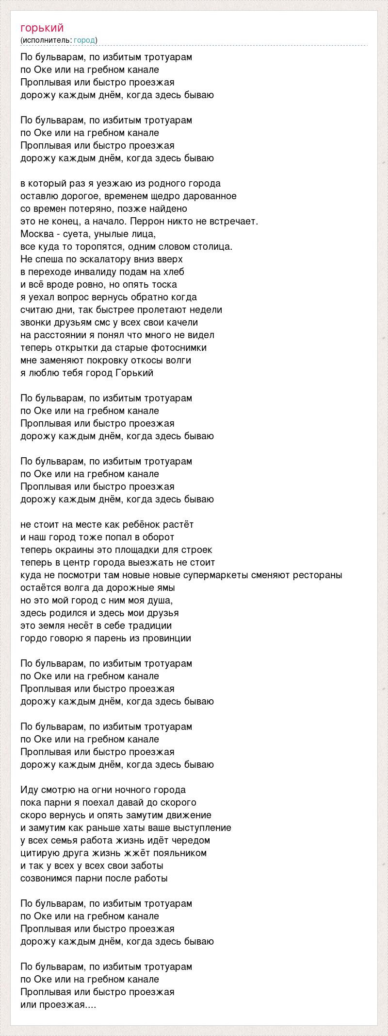 По бульварам, по избитым тротуарам по Оке или на гребном канале Проплывая или быстро проезжая дорожу каждым днём, когда здесь бываю По бульварам, по избитым тротуарам по Оке или на гребном канале Проплывая или быстро проезжая дорожу каждым днём, когда здесь бываю в который раз я уезжаю из родного города оставлю дорогое, временем щедро дарованное со времен потеряно, позже найдено это не конец, а начало. Перрон никто не встречает. Москва - суета, унылые лица, все куда то торопятся, одним словом столица. Не спеша по эскалатору вниз вверх в переходе инвалиду подам на хлеб и всё вроде ровно, но опять тоска я уехал вопрос вернусь обратно когда считаю дни, так быстрее пролетают недели звонки друзьям смс у всех свои качели на расстоянии я понял что много не видел теперь открытки да старые фотоснимки мне заменяют покровку откосы волги я люблю тебя город Горький По бульварам, по избитым тротуарам по Оке или на гребном канале Проплывая или быстро проезжая дорожу каждым днём, когда здесь бываю По бульварам, по избитым тротуарам по Оке или на гребном канале Проплывая или быстро проезжая дорожу каждым днём, когда здесь бываю не стоит на месте как ребёнок растёт и наш город тоже попал в оборот теперь окраины это площадки для строек теперь в центр города выезжать не стоит куда не посмотри там новые новые супермаркеты сменяют рестораны остаётся волга да дорожные ямы но это мой город с ним моя душа, здесь родился и здесь мои друзья это земля несёт в себе традиции гордо говорю я парень из провинции По бульварам, по избитым тротуарам по Оке или на гребном канале Проплывая или быстро проезжая дорожу каждым днём, когда здесь бываю По бульварам, по избитым тротуарам по Оке или на гребном канале Проплывая или быстро проезжая дорожу каждым днём, когда здесь бываю Иду смотрю на огни ночного города пока парни я поехал давай до скорого скоро вернусь и опять замутим движение и замутим как раньше хаты ваше выступление у всех семья работа жизнь идёт чередом цитирую друга жизнь жжёт пояльником и так у всех у всех свои заботы созвонимся парни после работы По бульварам, по избитым тротуарам по Оке или на гребном канале Проплывая или быстро проезжая дорожу каждым днём, когда здесь бываю По бульварам, по избитым тротуарам по Оке или на гребном канале Проплывая или быстро проезжая или проезжая....