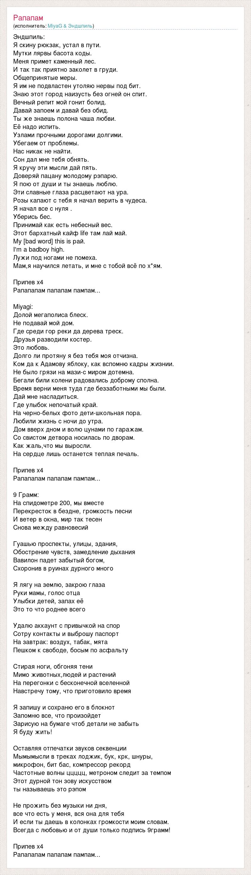 Эндшпиль: Я скину рюкзак, устал в пути. Мутки лярвы басота коды. Меня примет каменный лес. И так так приятно заколет в груди. Общепринятые меры. Я им не подвластен утоляю нервы под бит. Знаю этот город наизусть без огней он спит. Вечный репит мой гонит болид. Давай запоем и давай без обид. Ты же знаешь полона чаша любви. Её надо испить. Узлами прочными дорогами долгими. Убегаем от проблемы. Нас никак не найти. Сон дал мне тебя обнять. Я кручу эти мысли дай пять. Доверяй пацану молодому рэпарю. Я пою от души и ты знаешь люблю. Эти славные глаза расцветают на ура. Розы капают с тебя я начал верить в чудеса. Я начал все с нуля . Уберись бес. Принимай как есть небесный вес. Этот бархатный кайф life там лай май. My [bad word] this is рай. I'm a badboy high. Лужи под ногами не помеха. Мам,я научился летать, и мне с тобой всё по х*ям. Припев x4 Рапапапам папапам пампам... Miyagi: Долой мегаполиса блеск. Не подавай мой дом. Где среди гор реки да дерева треск. Друзья разводили костер. Это любовь. Долго ли протяну я без тебя моя отчизна. Ком да к Адамову яблоку, как вспомню кадры жизнии. Не было грязи на мази-с миром дотемна. Бегали били колени радовались доброму сполна. Время верни меня туда где беззаботными мы были. Дай мне насладиться. Где улыбок непочатый край. На черно-белых фото дети-школьная пора. Любили жизнь с ночи до утра. Дом вверх дном и волю цунами по гаражам. Со свистом детвора носилась по дворам. Как жаль,что мы выросли. На сердце лишь останется теплая печаль. Припев x4 Рапапапам папапам пампам... 9 Грамм: На спидометре 200, мы вместе Перекресток в бездне, громкость песни И ветер в окна, мир так тесен Снова между равновесий Гуашью проспекты, улицы, здания, Обострение чувств, замедление дыхания Вавилон падет забытый богом, Схоронив в руинах дурного много Я лягу на землю, закрою глаза Руки мамы, голос отца Улыбки детей, запах её Это то что роднее всего Удалю аккаунт с привычкой на спор Сотру контакты и выброшу паспорт На завтрак: воздух, табак, мята Пешком к свободе, босым по асфальту Стирая ноги, обгоняя тени Мимо животных,людей и растений На перегонки с бесконечной вселенной Навстречу тому, что приготовило время Я запишу и сохраню его в блокнот Запомню все, что произойдет Зарисую на бумаге чтоб детали не забыть Я буду жить! Оставляя отпечатки звуков секвенции Мымымысли в треках лоджик, бук, крк, шнуры, микрофон, бит бас, компрессор рекорд Частотные волны ццццц, метроном следит за темпом Этот дурной тон зову искусством ты называешь это рэпом Не прожить без музыки ни дня, все что есть у меня, вся она для тебя И если ты даешь в колонках громкости моим словам. Всегда с любовью и от души только подпись 9грамм! Припев x4 Рапапапам папапам пампам...