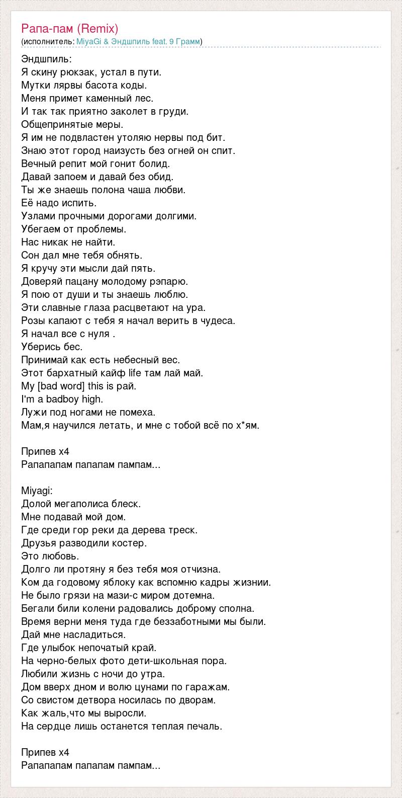 Эндшпиль: Я скину рюкзак, устал в пути. Мутки лярвы басота коды. Меня примет каменный лес. И так так приятно заколет в груди. Общепринятые меры. Я им не подвластен утоляю нервы под бит. Знаю этот город наизусть без огней он спит. Вечный репит мой гонит болид. Давай запоем и давай без обид. Ты же знаешь полона чаша любви. Её надо испить. Узлами прочными дорогами долгими. Убегаем от проблемы. Нас никак не найти. Сон дал мне тебя обнять. Я кручу эти мысли дай пять. Доверяй пацану молодому рэпарю. Я пою от души и ты знаешь люблю. Эти славные глаза расцветают на ура. Розы капают с тебя я начал верить в чудеса. Я начал все с нуля . Уберись бес. Принимай как есть небесный вес. Этот бархатный кайф life там лай май. My [bad word] this is рай. I'm a badboy high. Лужи под ногами не помеха. Мам,я научился летать, и мне с тобой всё по х*ям. Припев x4 Рапапапам папапам пампам... Miyagi: Долой мегаполиса блеск. Мне подавай мой дом. Где среди гор реки да дерева треск. Друзья разводили костер. Это любовь. Долго ли протяну я без тебя моя отчизна. Ком да годовому яблоку как вспомню кадры жизнии. Не было грязи на мази-с миром дотемна. Бегали били колени радовались доброму сполна. Время верни меня туда где беззаботными мы были. Дай мне насладиться. Где улыбок непочатый край. На черно-белых фото дети-школьная пора. Любили жизнь с ночи до утра. Дом вверх дном и волю цунами по гаражам. Со свистом детвора носилась по дворам. Как жаль,что мы выросли. На сердце лишь останется теплая печаль. Припев x4 Рапапапам папапам пампам...